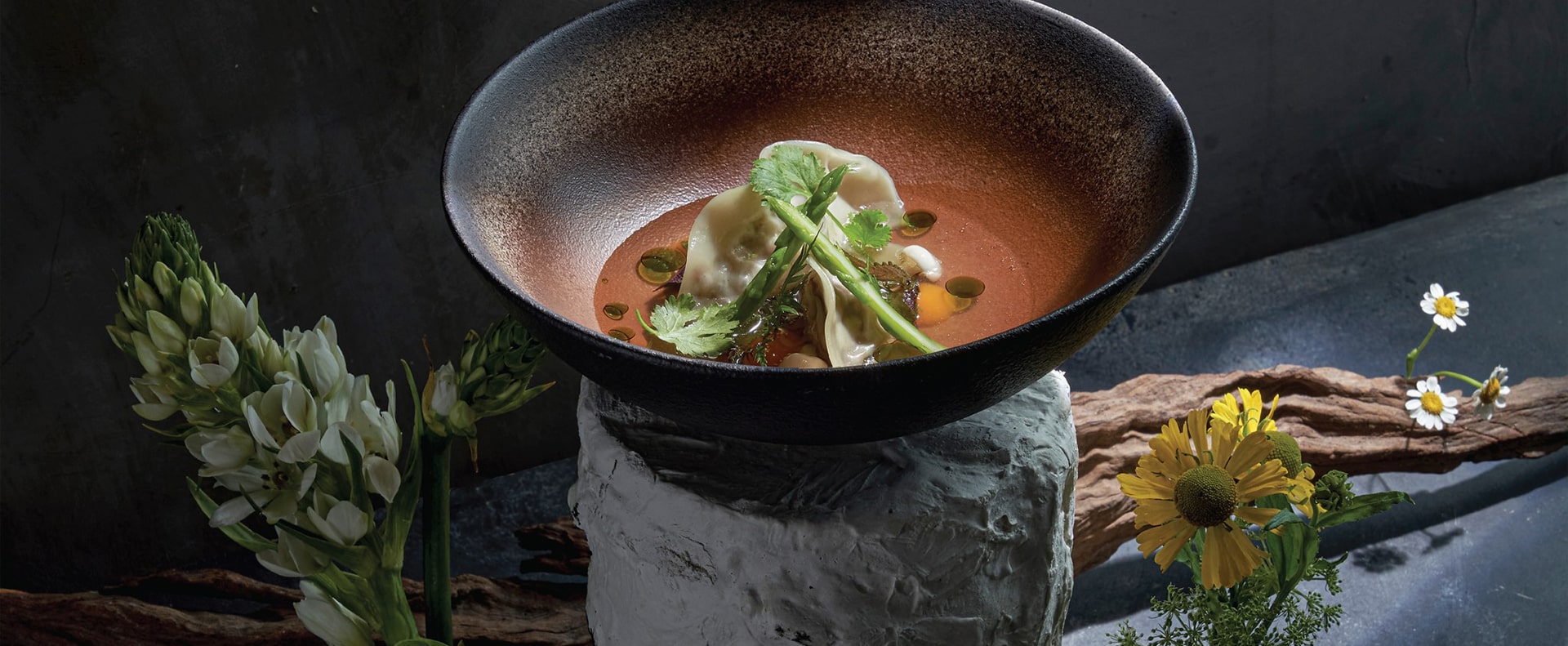 There’s plenty to delight and surprise. Super-sized bronze and glass kinetic hanging sculptures are designed to echo your flow as you drift and hover around the live food stations and enjoy.